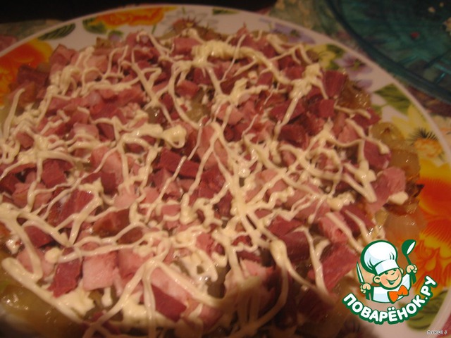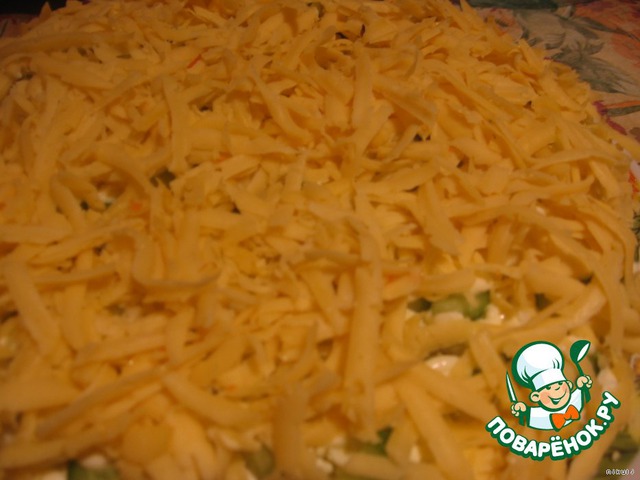 Салат выкладывается слоями. Каждый промазать майонезом.