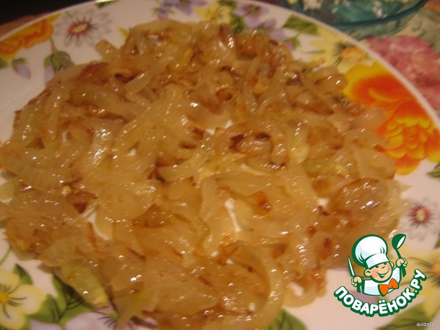 1. Лук порезать полукольцами, пожарить до золотистого цвета на растительном масле, на бумажное полотенце, потом на тарелку, когда остынет.