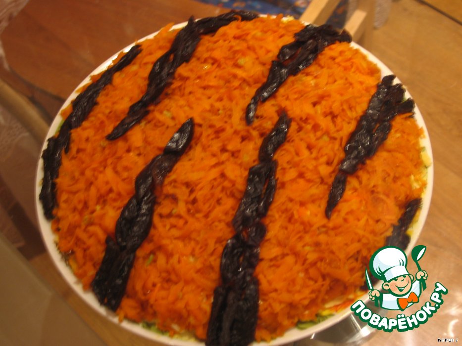 6. Морковь натереть на крупной терке, жарить на растительном масле до готовности, в конце посолить, добавить паприку и давленный чеснок. Когда остынет, накрываем салат, делаем декор тигровой шкуры черносливом.