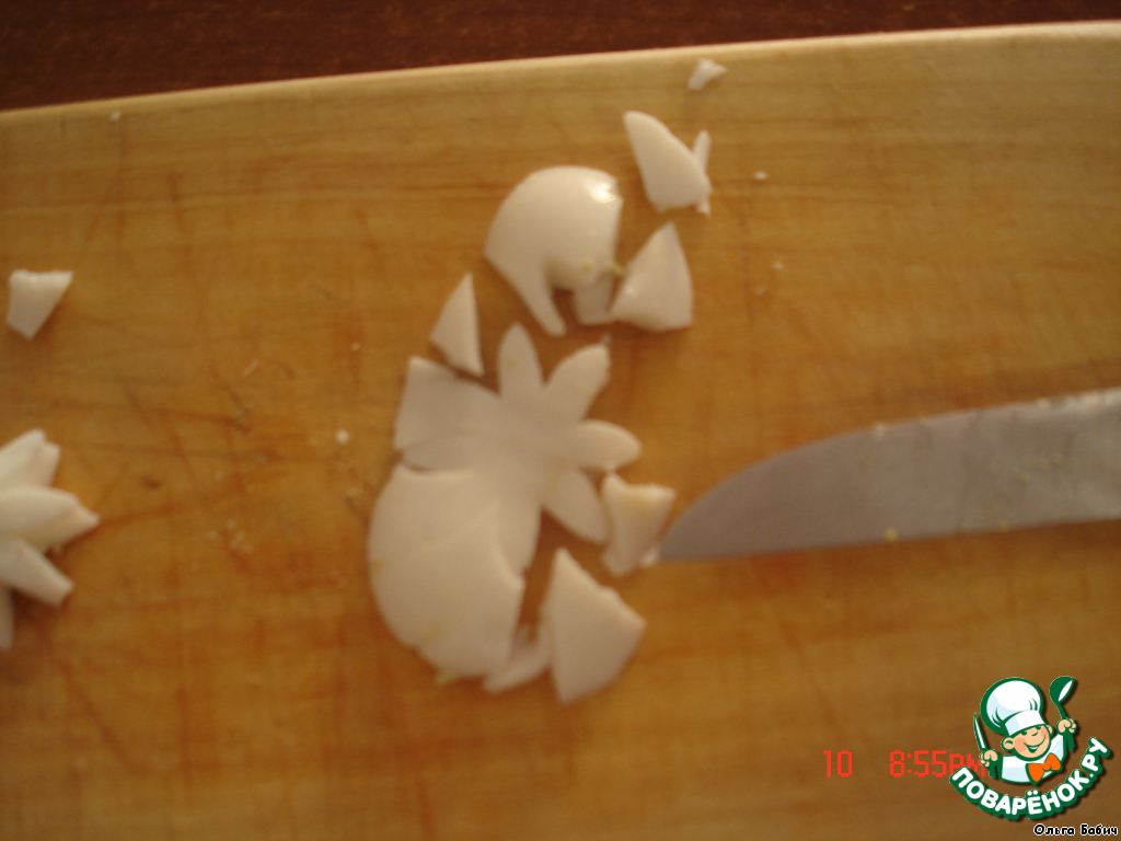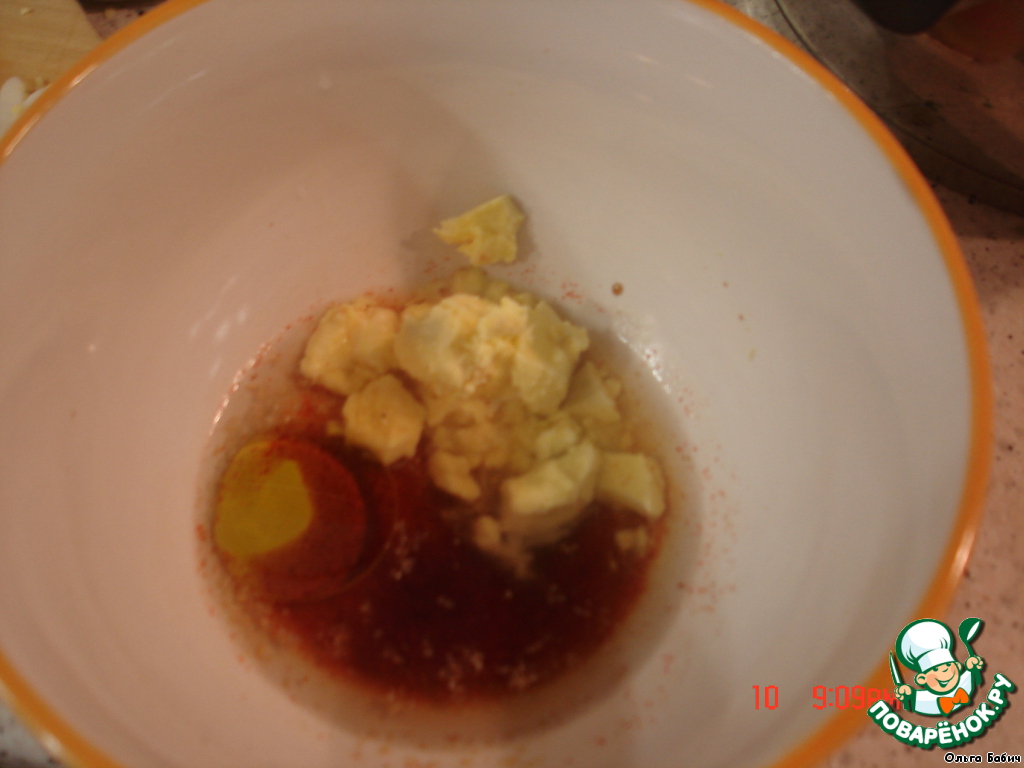 Приготовим соус: смешать 1 желток, масло, соевый соус, коньяк, черный душистый перец, бульон