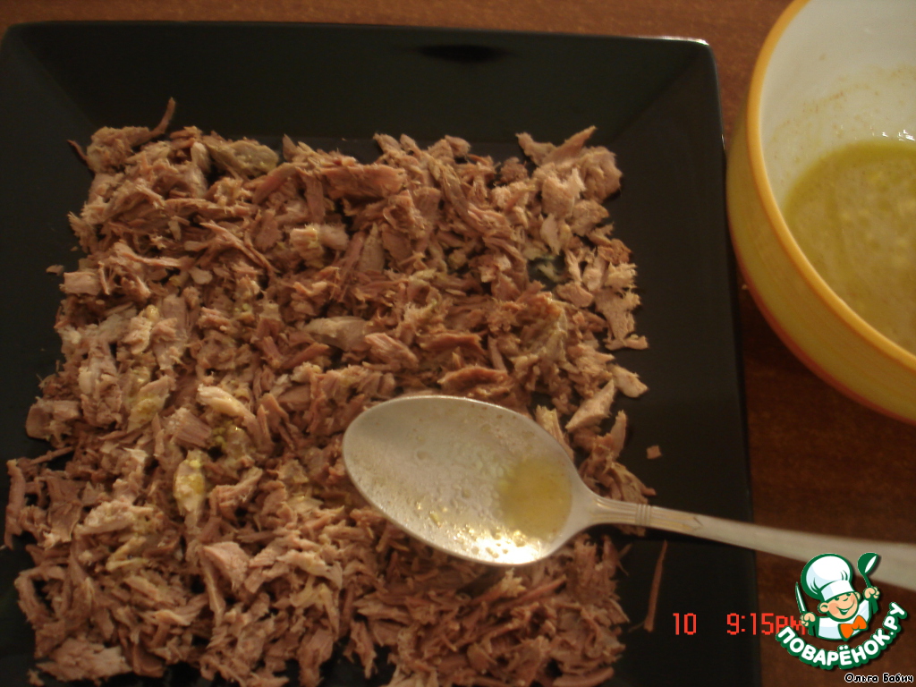 Свинину мелко порезать, вернее постараться разобрать на нити, полить соусом