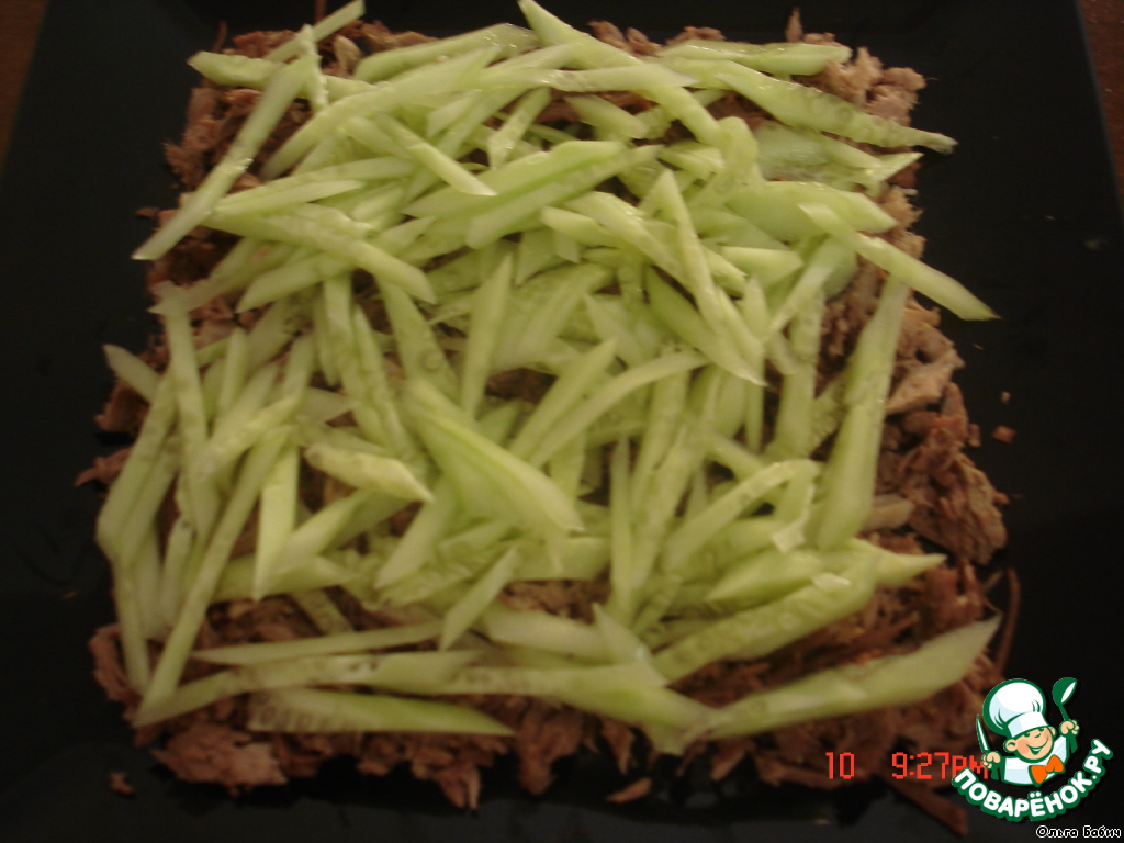 Сверху почищенный и мелко порезанный соломкой огурчик, полить соусом