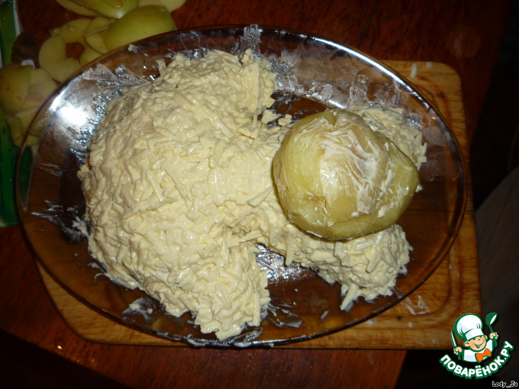 Тертый сыр смешиваем с майонезом, обмазываем салат полностью, стараясь придать нужную форму и скрыть все темные пятна.