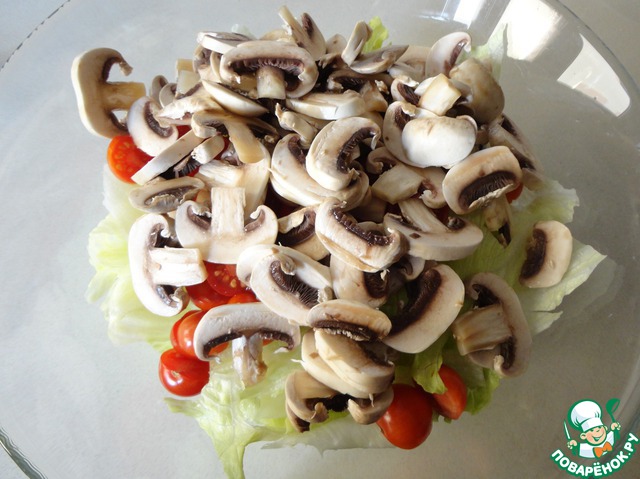 Шампиньоны режем пластинками, поливаем лимонным соком. Аккуратно перемешиваем.