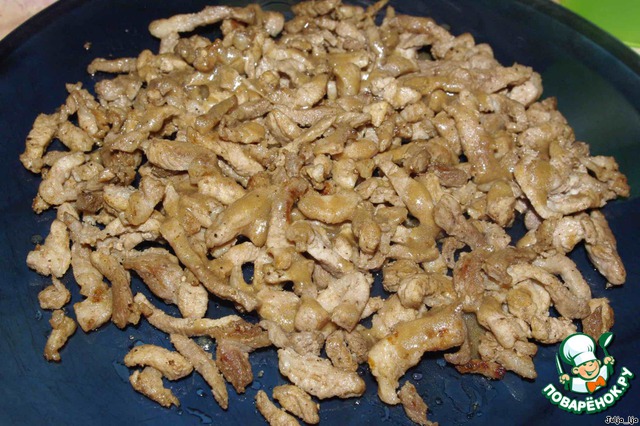 Мясо нарезаем соломкой и обжариваем на растительном масле. Солим и перчим - по вкусу. Добавляем 1 ст. ложку бальзамического уксуса.