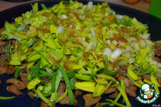 Далее, зелёную часть лука-порея нарезаем соломкой, выкладываем вторым слоем.