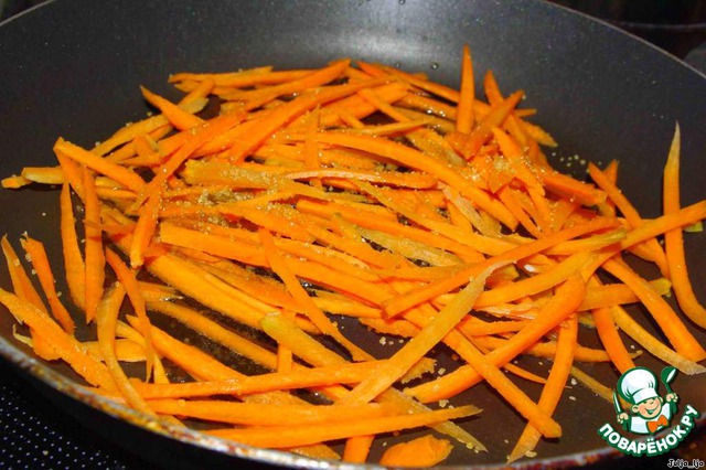 Морковь обжариваем на растительном масле с добавлением щепотки сахара. Обжариваем на большом огне, довольно быстро. Морковь должна оставаться полусырой. В конце добавляем уксус (обычный), перемешиваем, держим на огне 30 секунд, снимаем и отделяем морковь от уксуса.