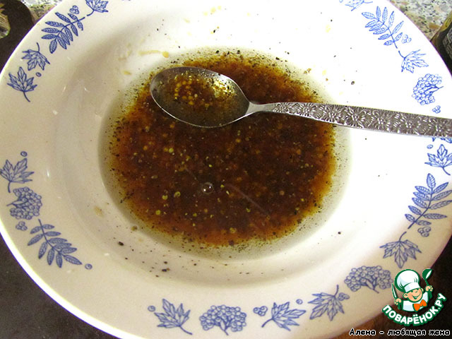 Приготовить заправку: смешать масло растительное, соус соевый, горчицу и уксус, по вкусу можно добавить перец.