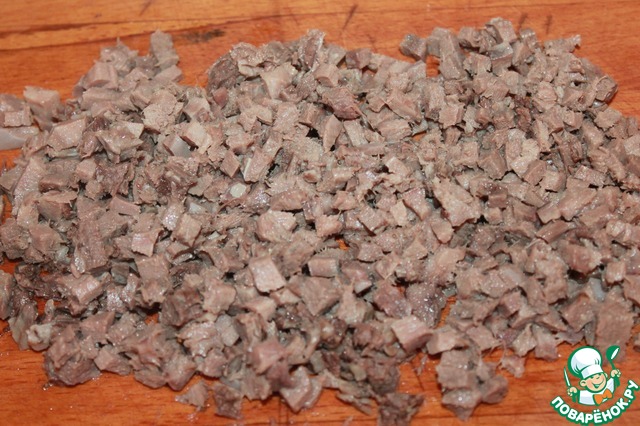 Отвариваем язык, остужаем и чистим его. Нарезаем мелкими кубиками. Можете взять говяжий язык.
