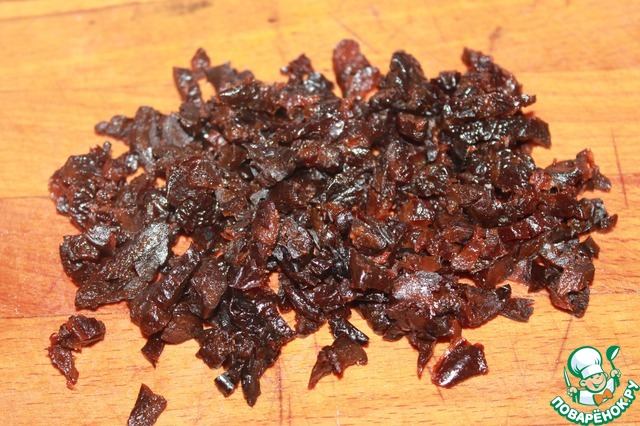 Мелко нарезаем чернослив. Если он у вас засушен, то замачиваем на несколько минут в горячей воде.