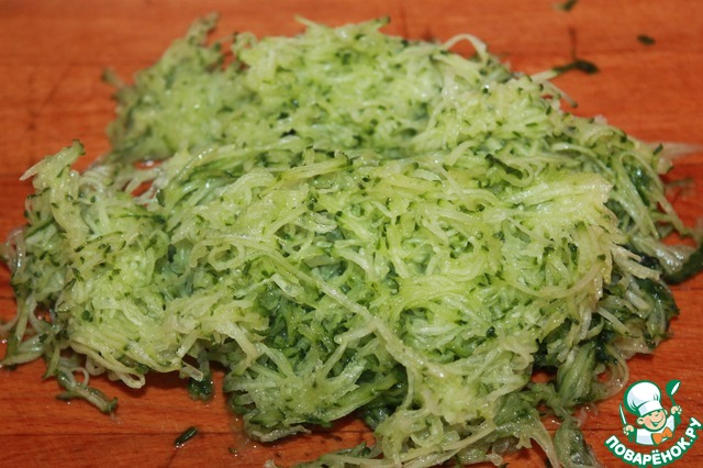 Огурец трем на мелкой терке, отжимаем от сока.