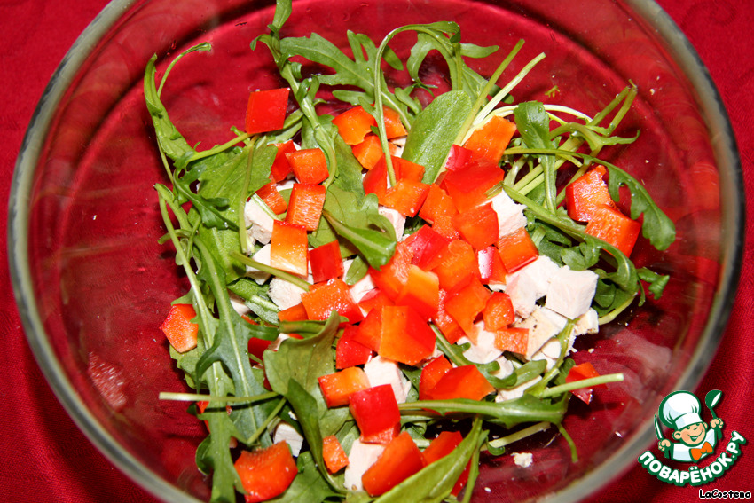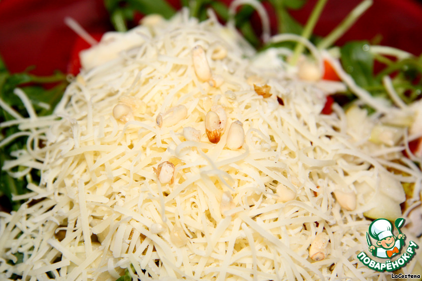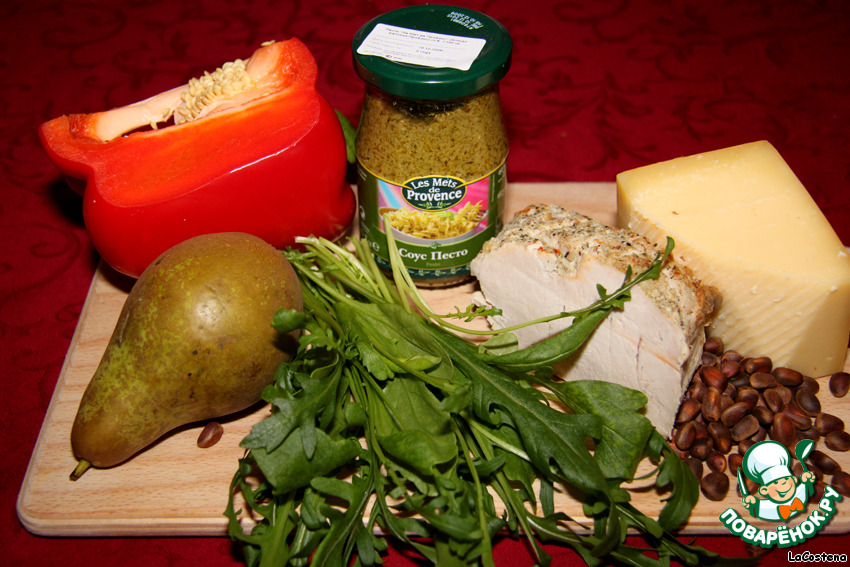 Нам понадобятся: буженина, руккола, груша, сладкий перец, сыр пармезан и кедровые орешки. Заправлять салат будем оливковым маслом и соусом Песто.
