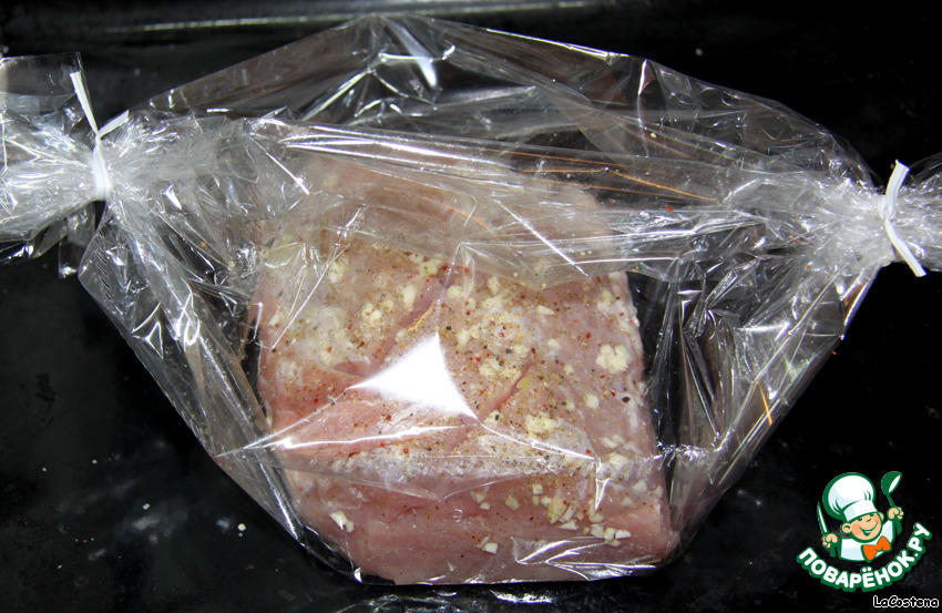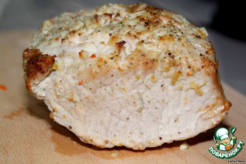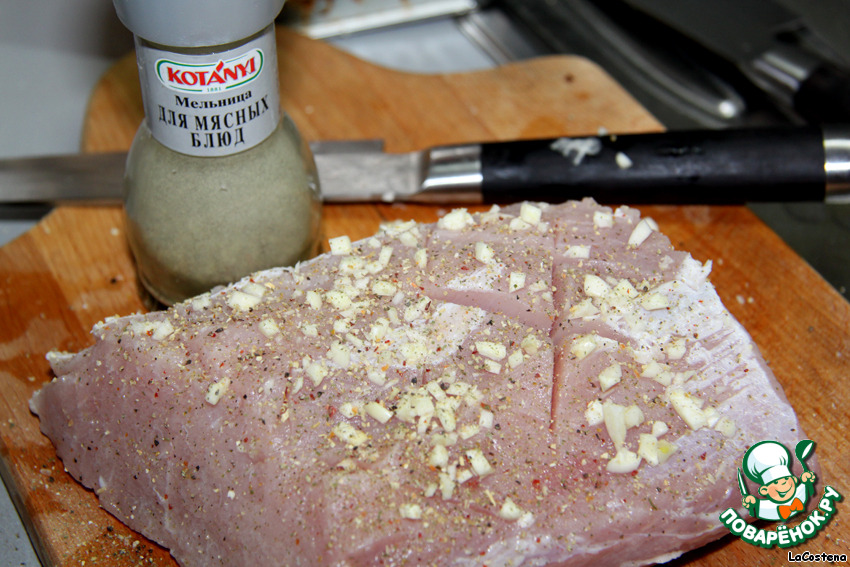 Несколько слов про мясо. Буженину я готовлю в домашних условиях и, на всякий случай, выкладываю способ ее приготовления. Свинину очистить от жира, сделать надрезы и натереть чесноком.