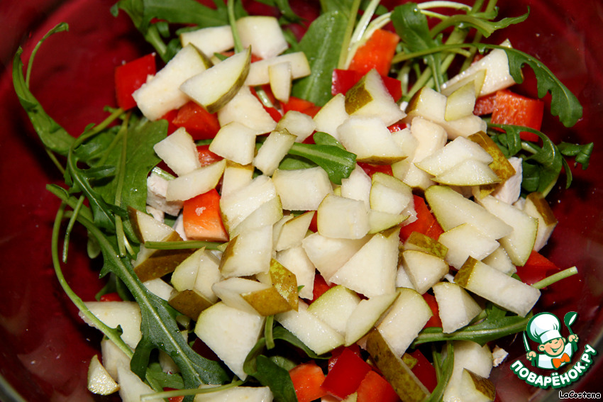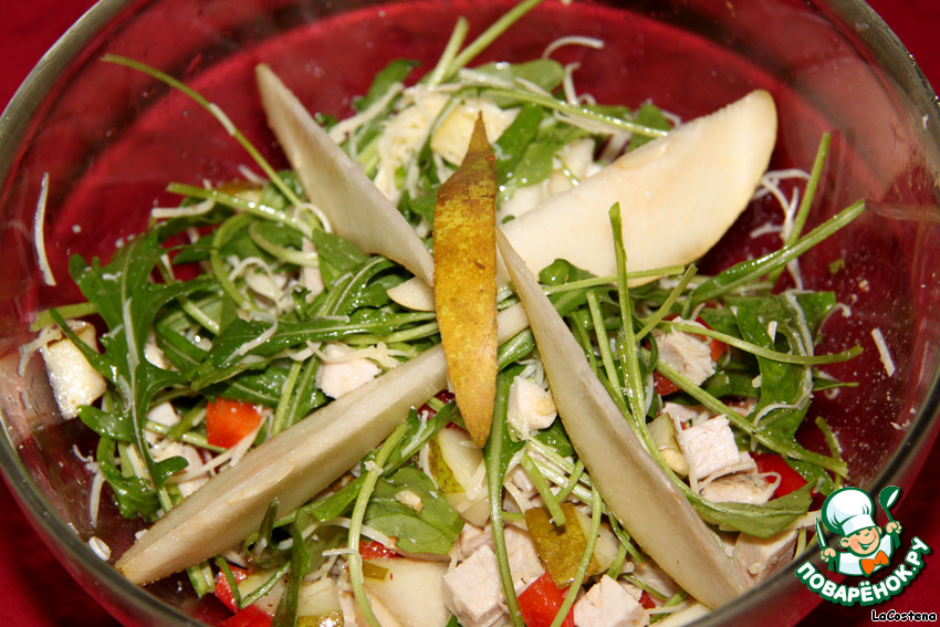 | Сочетание сладкой груши, нежной буженины и горьковатой рукколы делают этот салат украшением праздничного стола. |