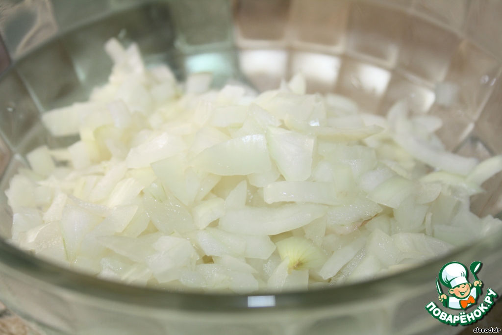 Лук режем кубиками, ошпариваем кипятком.