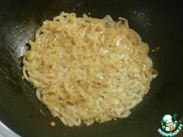 Очищенный лук нарезаю полукольцами и обжариваю до золотистого цвета, в масле, в котором обжаривались кусочки мяса.