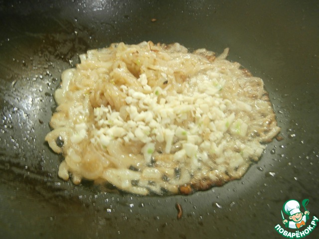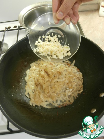 Чеснок мелко крошу ножом и смешиваю с пассированным луком,