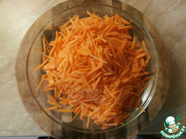 Морковь очищаю, промываю и нарезаю тонкой соломкой.