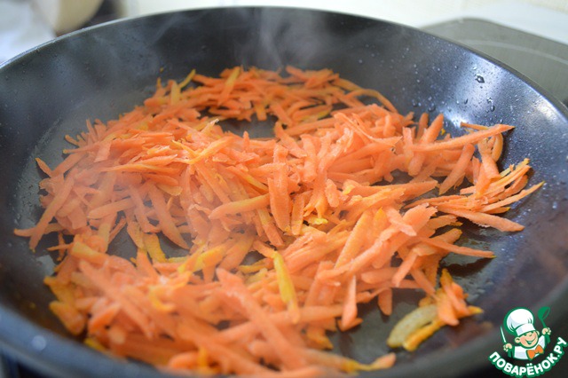Почистить и обжарить лук до золотистого цвета. Почистить и обжарить морковь до золотистого цвета.
