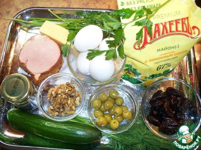 | Этот салат имеет приятный вкус. Окорок и сыр интересно дополнены черносливом и оливками. Каперсы и грецкий орех, также, добавляют пикантный вкус. Салат понравится любителям мясных закусок. |