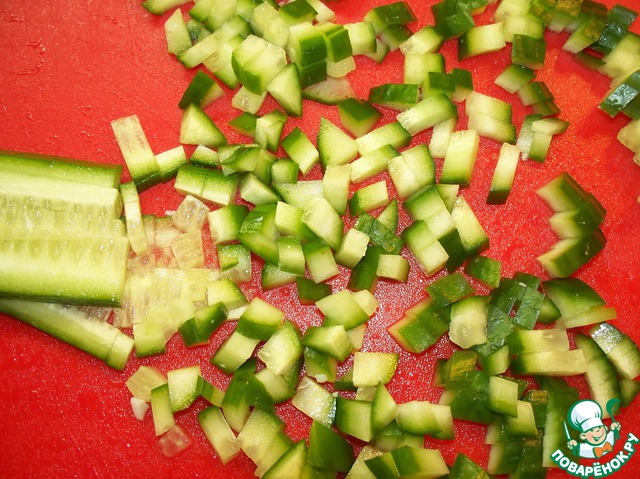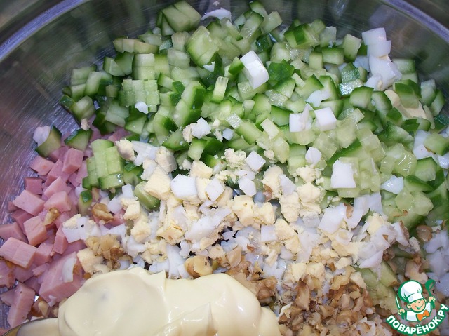 Так же поступаем с яйцами и обжаренными орехами. Все ингредиенты смешиваем, добавляем майонез"Махеев".