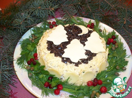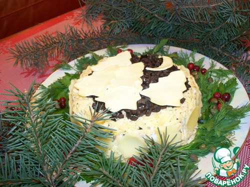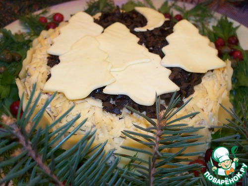 Выкладываем салат на блюдо. Сверху трем сыр на крупной терке и выкладываем маслины по центру.