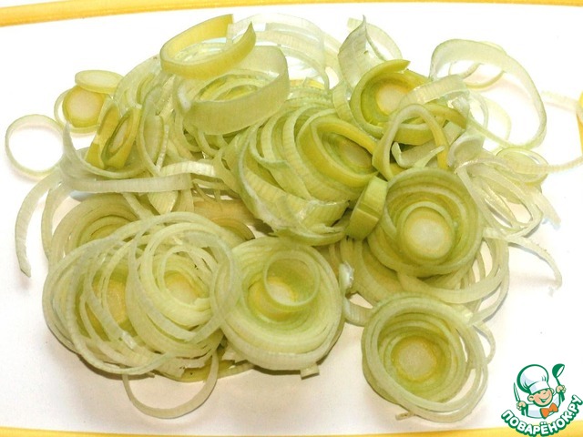 Лук - порей нашинковать тонкими кольцами. Белую часть кладем в миску, а зеленую часть выкладываем в сковороду и тушим с обжаренными грибами 5-8 мин.