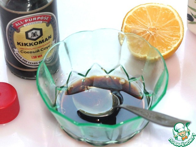 Оливковое масло смешать с соевым соусом и лимонным соком.
