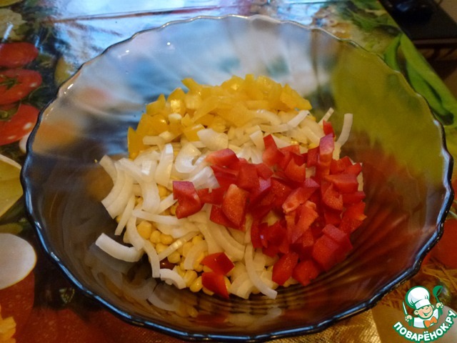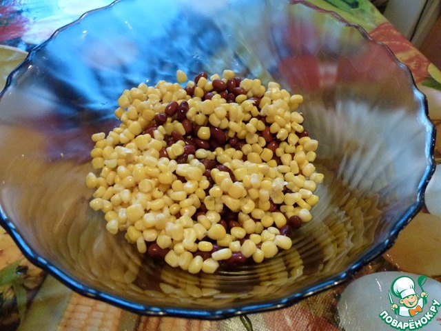 Сливаем лишнюю жидкость с фасоли и кукурузы, выкладываем в салатницу.