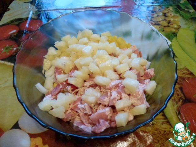 Добавляем нарезанные кусочками ананасы. Внимание! Они очень сочные, поэтому обязательно слейте жидкость, иначе салат "поплывет".