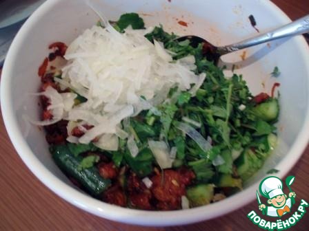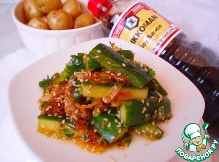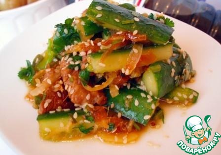 Снять с огня и добавить к огурцам. Выдавить к огурцам чеснок, добавить отжатый лук, мелко порезанную кинзу, протертый имбирь, уксус и все тщательно перемешать. Дать салату настояться 20-30 минут.