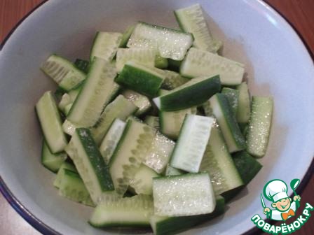 Огурцы нарезать брусочками и посолить, оставить на 20 минут, затем слить образовавшуюся воду. Я не отжимаю огурцы, чтобы не потерять товарный вид.