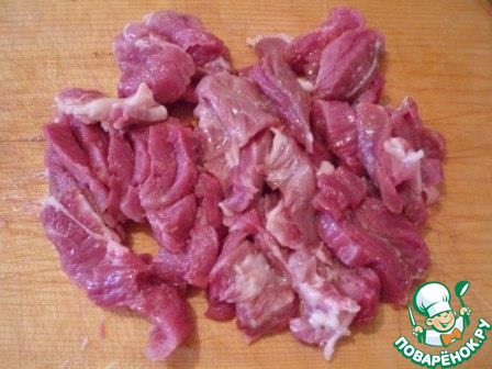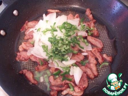 К свинине добавить вторую часть лука и перчика чили, все хорошо перемешать и обжарить до золотистого цвета лука.