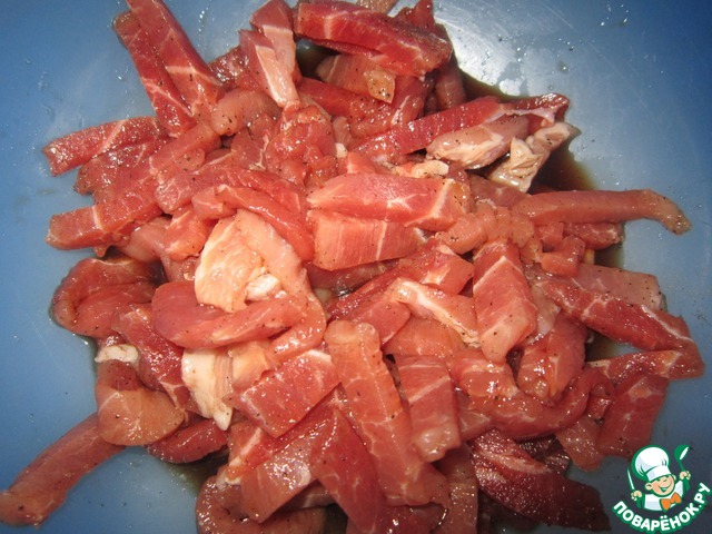 Подготовленную свинину нарезать тонкой соломкой, замариновать с соевым соусом и специями, оставить минут на 40.