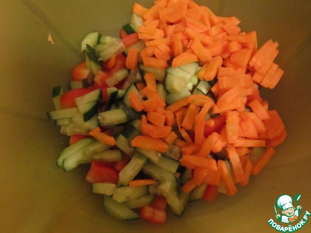 Перец помыть, удалить плодоножку с семенами, нарезать соломкой. Огурец помыть, срезать плодоножку, нашинковать крупной соломкой длиной 5см, шириной 0,5см. Морковь очистить, помыть, нарезать соломкой.