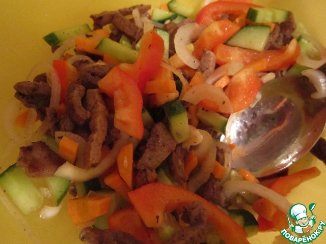 Овощи соединить с обжаренным мясом, полить заправкой и перемешать.