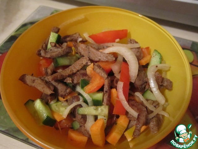 | Великолепный салат из свежих овощей и жареного мяса! Без майонеза! Довольно сытный салат, для меня - это полноценный ужин. |