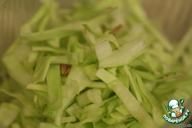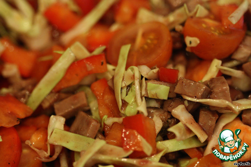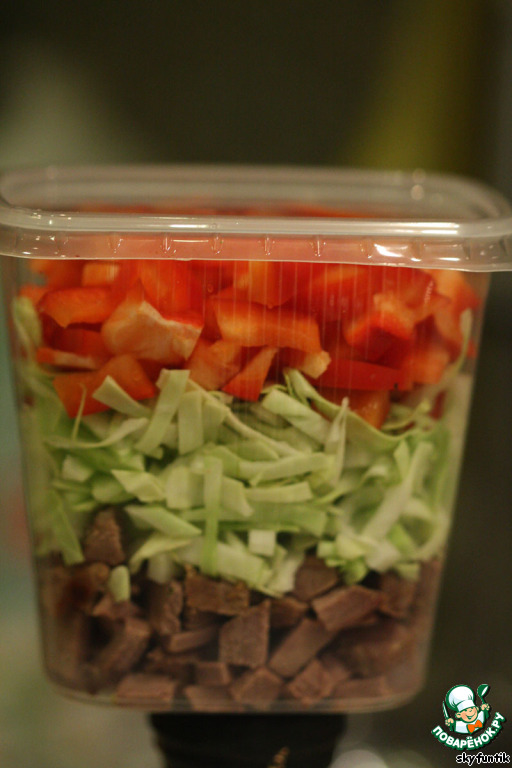 Нарезаем мелко мясо (сорри, забыла сфоткать :-| ), капусту и перец.