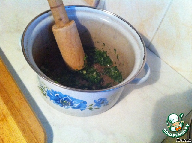 В первую очередь моем зелень. Затем ее мелко режем и отправляем в емкость, в которой будем готовить салат. Берем толкушку и толчем порезанную зелень. Когда зелень даст сок надо ее посолить и перемешать. Этот шаг очень важен, так как толченая зелень даст вкус салату.