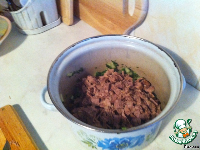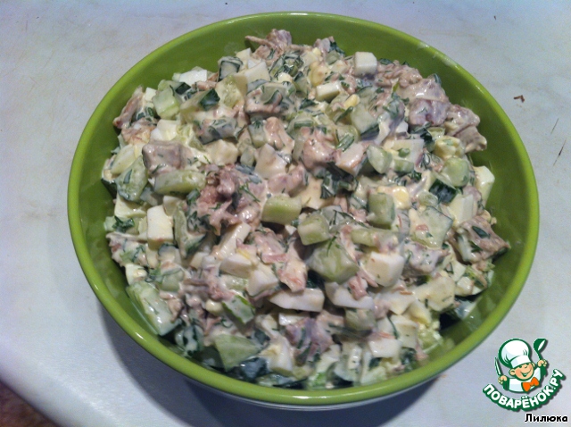 | Этот простой и в то же время вкусный салатик готовится в нашей семье уже много лет. Сам рецепт был взят из большой кулинарной книги, подаренной мне мужем. Я думаю, что данный мясной салатик придется многим по вкусу. |