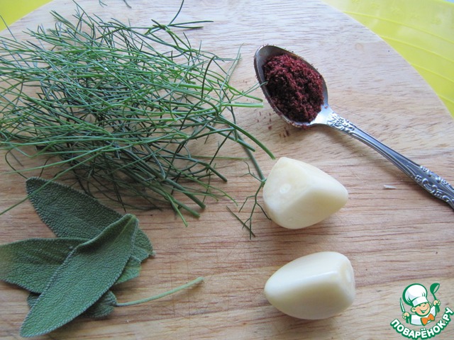 Для приготовления заправки для салата использую молоденькую травку фенхеля, очищенный чеснок, листочки шалфея, сумах (для придания легкой кислинки). Травку измельчить помельче вместе с чесноком.