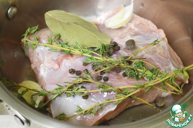 1. Мясо отварить с добавлением лаврового листа, чеснока, тимьяна, душистого и черного перца.