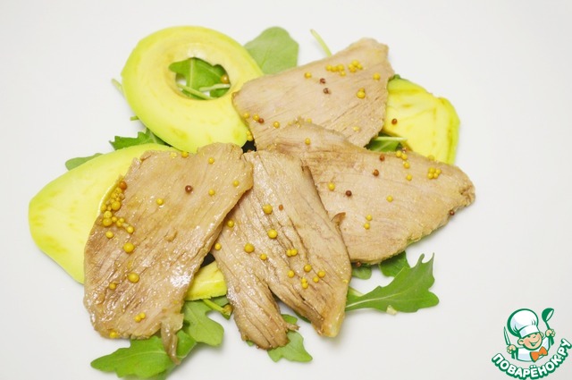 3. Сделать заправку. Смешать горчицу, масло, лимонный сок и мед, посолить, поперчить и хорошо взболтать. Половину заправки добавить к мясу, перемешать. Авокадо почистить и нарезать пластинками. Рукколу вымыть, обсушить.