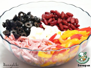 Фасоль и все оставшиеся ингредиенты смешать в чашке с майонезом, солить и перчить по вкусу. С солью не перебарщивайте, так как маслины солёные.