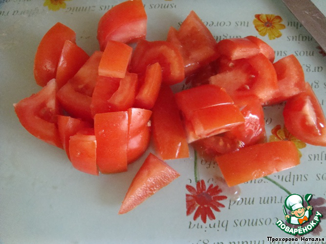 Помидор тоже порезать крупными квадратиками.