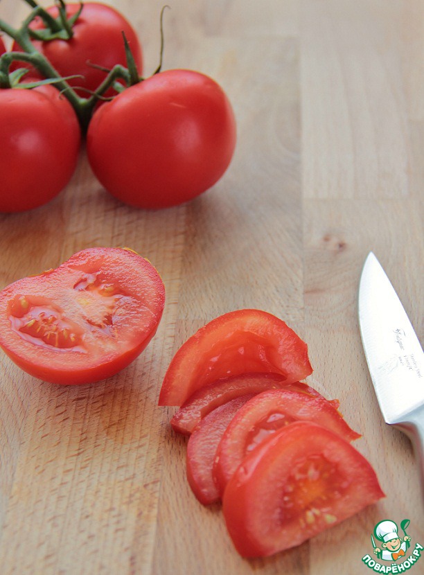 Помидор помыть и нарезать кольцами.