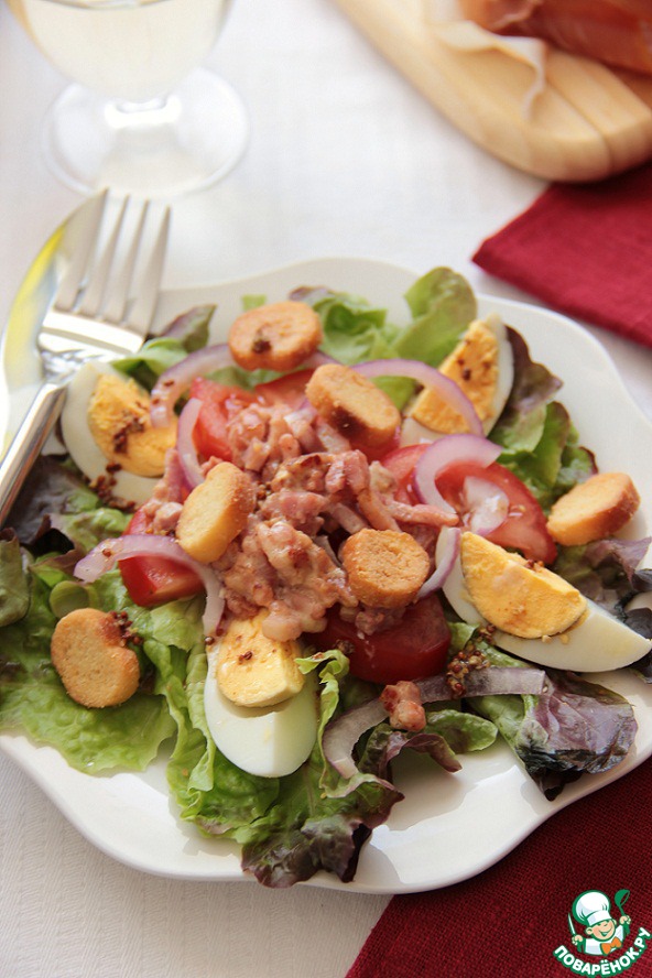 На тарелку или в блюдо выложить листья салата, в центр - помидоры, выложить четвертинки яйца, лук, посыпать сухариками, добавить еще теплый бекон, полить соусом. Перемешать и кушать.