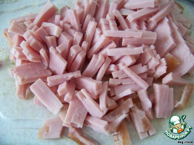 Ветчину (подойдет любой варено-копченый мясной продукт, главное, чтобы без жировых прослоек) нарезаем тонкими ломтиками.