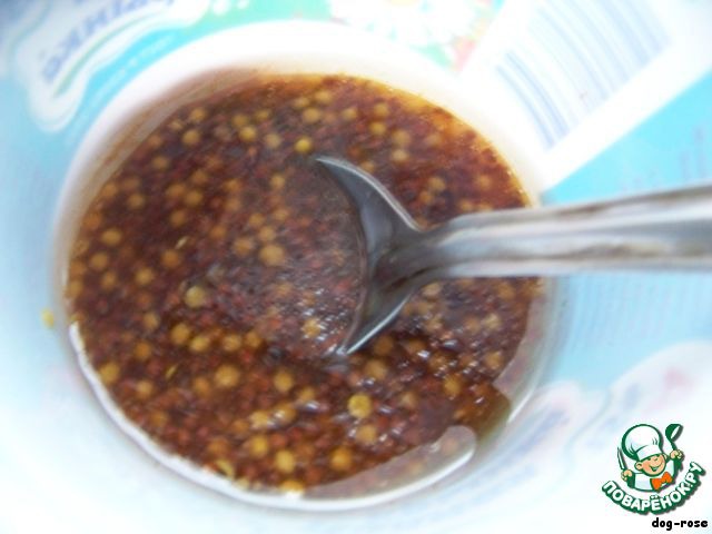 Заправка: смешиваем растительное масло, горчицу, соевый соус, чуть-чуть соли.
