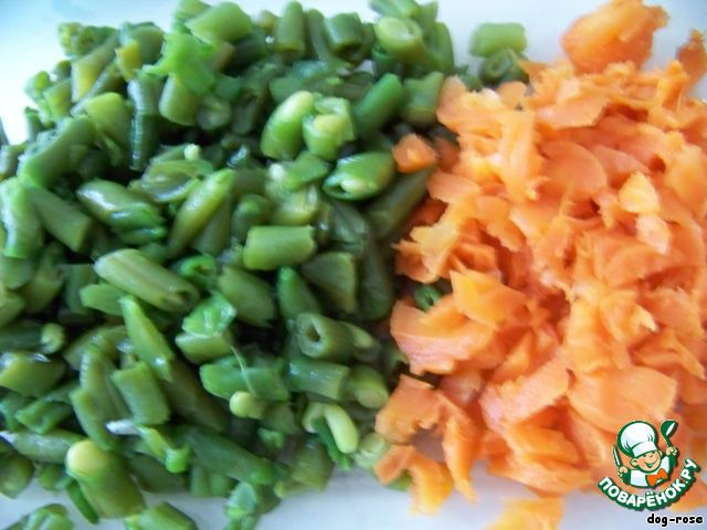 Замороженную фасоль бросаем в кипяток, отвариваем минут 10, сливаем воду и охлаждаем. Затем режем.